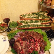 When serving, arrange the slices of lamb on a plate, drizzle with the sauce, and sprinkle with the remaining pomegranate seeds. Serve with boiled rice and herbs.