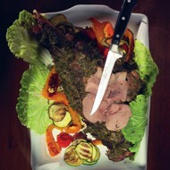 After the specified hours, remove the leg from the refrigerator and place it on a baking tray. Put the tray in an oven preheated to 428°F. Keep the leg at this temperature for fifteen minutes. Then reduce the heat to 356°F and continue cooking the leg for another forty minutes. After that, increase the heat back to 428°F and allow the leg to cook in the oven for an additional ten minutes. Remove from the oven, slice thinly, and serve with grilled vegetables.