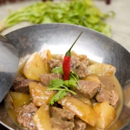 Layer half of the sliced potatoes in the bottom of a large baking dish. Pour the onion-wine mixture over the potatoes, followed by the garlic, thyme, and olives in succession. Top with the meat (4 portions) and a second layer of potatoes. Pour the broth over everything.