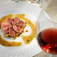 Arrange the vegetables on a plate, top with slices of lamb, and drizzle with sauce.