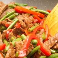 Next, add the sautéed onion, finely chopped green beans (cleaned of strings), chopped red pepper, season with salt and pepper, and continue simmering until the lamb is fully cooked.