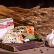 Place the lard in a bowl. Add salt, a crushed garlic clove, a bay leaf, a handful of crushed black peppercorns, and 2-3 cloves. Mix well so that the salt and spice mixture coats each piece of lard.