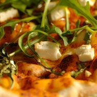 Lavash pizza with greens, gorgonzola, and roasted almonds