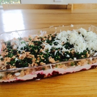 Layer 1: Boil or bake the beet, grate it, and place it in a wide shallow dish.