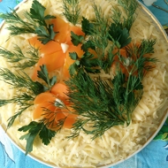 Next, layer all the ingredients, spreading mayonnaise on each layer, in the following order: fillet, cucumbers, potatoes, mushrooms, onions, eggs, and cheese. Top with decorations of your choice.