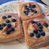 Fill the tartlets with cream, then add nectarine, raspberries, and blueberries.