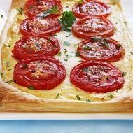 Lightly cool the dough and drizzle with olive oil (2 tablespoons), sprinkle with thyme, then top with tomatoes and olives before placing in the oven.