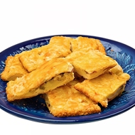 Divide the dough into two parts and roll them out separately. Place one part of the dough on a baking sheet, top with the potato filling, cover with the second part of the dough, and pinch the edges. Cut a round hole in the middle of the top layer. Bake at 356°F for 30 minutes.