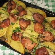 Peel 5–6 potatoes and cut them into wedges, thinner than for frying.