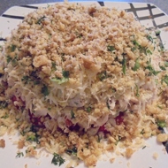 Finish the salad with walnuts, generously sprinkling them over the 'cake'.