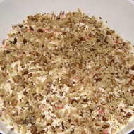 The top can be decorated with crushed and roasted walnuts. They add a savory flavor, and the salad looks beautiful.