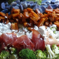 Layered Vegetable Salad with Prosciutto and Feta on a Board