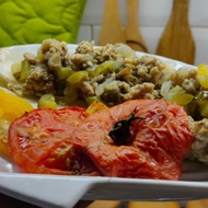 While the minced meat is frying, chop the bell pepper and tomato.