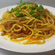 So, if you have any leftover minced meat after making the consomme, simply take a deep skillet, heat some olive oil in it, lightly sauté the minced meat, add chopped tomatoes, and simmer on low heat for about fifteen minutes. If the sauce becomes too thick, you can add water, broth, or tomato juice. Season with salt and pepper at the end.