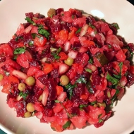 Grate the onion, pickles, carrots, potatoes, and beets on a coarse grater. Add the sauerkraut. Season with salt and pepper. Dress the vinaigrette with oil and vinegar or lemon dressing.