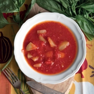 Remove the stems, seeds, and white membranes from the bell peppers. Cut the peppers into small squares and add them to the hot tomato mixture.