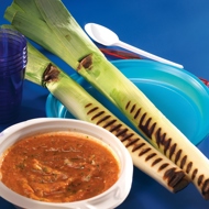 Grill the leek stalks over an open flame, not worrying if the outer layers start to char and burn. Grill for about five minutes, turning constantly. Remove the leeks from the heat and enjoy by peeling off the burnt outer layers and dipping them in spicy garlic mayonnaise.
