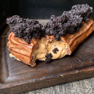 Assemble the éclair: make three small holes on the bottom side of the éclair and fill it generously with cream, then top the éclair with a mound of poppy seed icing.