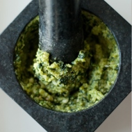 Once again, I am replacing my favorite measurement 'a handful' with 'a bunch': you need 3 bunches of basil leaves. Of course, you can substitute a mortar and pestle with a blender.