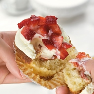 Make a hole in the center of the cupcake, remove the core, and fill the indentation with rhubarb and strawberry puree. Top with cream and garnish with fresh strawberries.