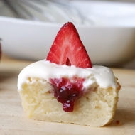 Once the cupcakes have cooled, use a small knife to cut out a cone-shaped piece from the top of each cupcake. Trim the bottom of the cone, fill the hole with jam, and replace the top with the remaining part of the cone.