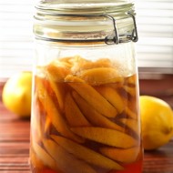 After an hour, drain the cooled syrup into a container, boil for 10–15 minutes, and pour it back over the lemons.