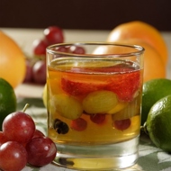 Strain the hot syrup through a cloth, slightly cool it, pour into bowls or molds in a layer of 1–2 cm, and let it set. Place various fruits on the set layer of jelly and pour the semi-set jelly over them so that it covers the surface of the fruits, and cool again.