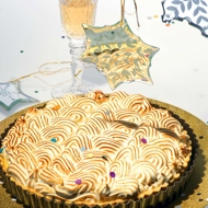 Whip the egg whites. Gradually pour in the syrup and continue whipping until the meringue cools down. Use it to decorate the pie and briefly torch it for a delicate brown color.