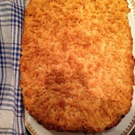 Roll out the dough that was in the fridge to a thickness of 0.5–1 cm to fit the baking dish. Place it in the dish. Pour the filling on top. Take the dough from the freezer and grate it on top of the filling using a coarse grater.