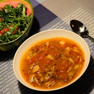 Divide the chicken meat into pieces and add it to the soup. Optionally, sprinkle with herbs when serving.