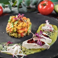 This salad is an ode to legumes: lentils and red beans make up the salad, while white beans form the dressing, accompanied by neatly arranged tofu cubes on the plate. If you want to add a substantial dose of fiber, iron, and dietary vegetarian protein to your diet alongside these beans, here’s a beautiful way to do it. Additional delights come from finely chopped tomatoes, Dijon mustard, sweet and sour Chinese sauce, and balsamic glaze, which dress the salad in moderate amounts to prevent excessive starchiness and monotony from the legume mix. Recipe from a popular American bistro.