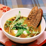 Ladle the soup into bowls, add mozzarella to each bowl, and garnish with arugula leaves and pumpkin seeds. Serve with wheat toast.
