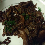Add the cooked lentils to the pan with mushrooms and onion, season with salt and pepper, stir, and simmer all together under a lid for 5-7 minutes.