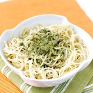 In a blender, grind the pumpkin seeds, then add the garlic, water, and basil. Blend again.