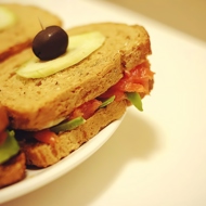 Spread the sauce on the bread. On one half, layer slices of avocado, thinly sliced fish, and cucumber. Top with the remaining bread and gently press down. Cut each sandwich in half diagonally.