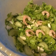 Combine the salad leaves with the shrimp, finely chopped cucumber, and finely chopped cheese.