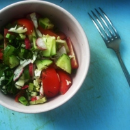 Chop the vegetables. Cut the tomatoes into wedges, the cucumbers into slices, the celery stalk finely, and the radishes into rounds.