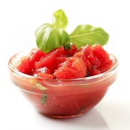 Cut the tomatoes into small cubes and transfer them to a bowl.