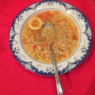 Remove the pearl barley, drain it in a colander, rinse with cold water, and add it to the soup. Cook for about one and a half to two hours until the lamb is completely tender.