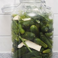 Select and rinse the cucumbers, placing them in a jar, layering with seasonings (dill and garlic).