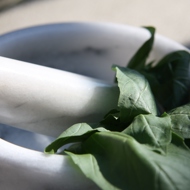 Combine the nuts and garlic in a mortar, grinding everything in circular motions.