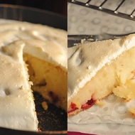 In fact, the pie is enough to sprinkle with powdered sugar, place a couple of raspberries on top, and it will already look beautiful, but you can go further — whip one egg white with 50 g of sugar until stiff peaks form, spread the meringue on the pie, and place it under the broiler at maximum temperature for literally 1–2 minutes. Do not step away from the oven! The egg white will turn golden-brown instantly!