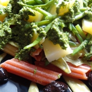 I recommend making the pesto yourself: for a bunch of basil (you can mix it with cilantro), use 3 cloves of garlic, and add a handful of pine nuts; in a blender, gradually pour in olive oil until you reach the desired consistency, adding salt and pepper. Finally, add grated Parmesan or Pecorino cheese.