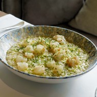 2–3 minutes before the risotto is done, season it with salt and pepper, and add limoncello. Allow the alcohol to evaporate.
