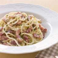 Remove the dish with bacon from the oven, add the linguine, mix well, and if necessary, add a little of the reserved water.