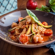 In olive oil, sauté the garlic and shrimp. As soon as the shrimp begin to lose their transparency, add the zucchini and cherry tomatoes. Cook until the zucchini is tender, then season with salt and pepper.