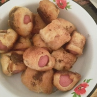 Roll out the dough and cut it into strips measuring 7.5 cm long and 1.5 cm wide. Wrap the strips of dough around the sausages in the middle and pinch the edges to seal. Place them on a baking sheet and put it in the freezer for 15 minutes.