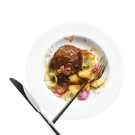 A culinary trick. Flan is a classic Spanish dessert, something between crème caramel and mousse—light, sweet, and delicate. When prepared correctly, liver can take on a surprisingly sweet flavor. This recipe incorporates anise and apples (as a garnish) along with flour and eggs, resulting in a fluffy liver cake. To bring it back to its meaty roots, the flan is drizzled with a demi-glace upon serving.