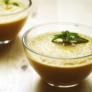 Ladle into soup bowls and garnish with herbs.