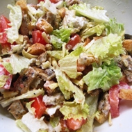 In a salad bowl, toss in the lettuce leaves, sliced chicken, and pour the sauce over everything. Next, prepare the croutons. I make them in a special toaster (similar to a mini-oven), but if you don’t have one, you can fry them in a pan.